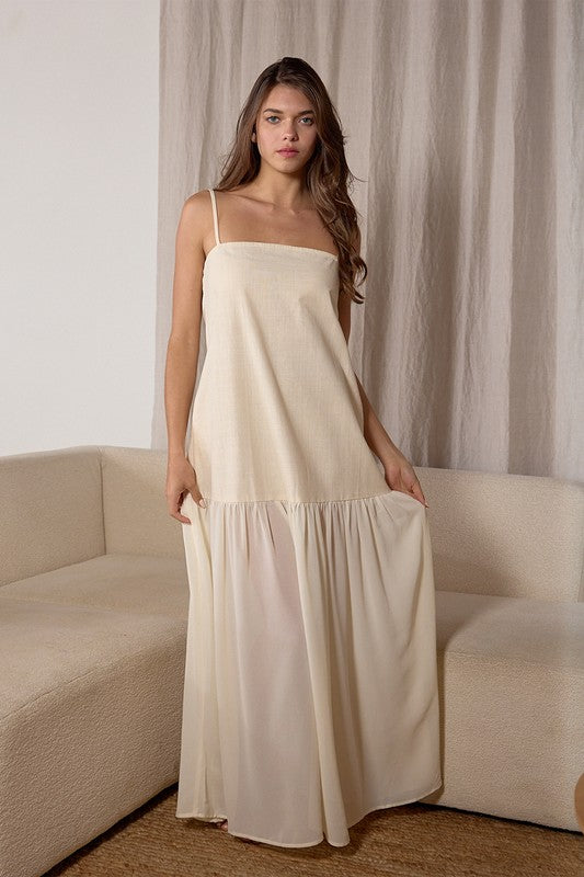 Beautiful maxi dress with thin adjustable straps. Side zip, elastic back waist and side pocket. Fabrication is 85% Cotton and 15% Linen; the bottom sheer panel is 100% Polyester.