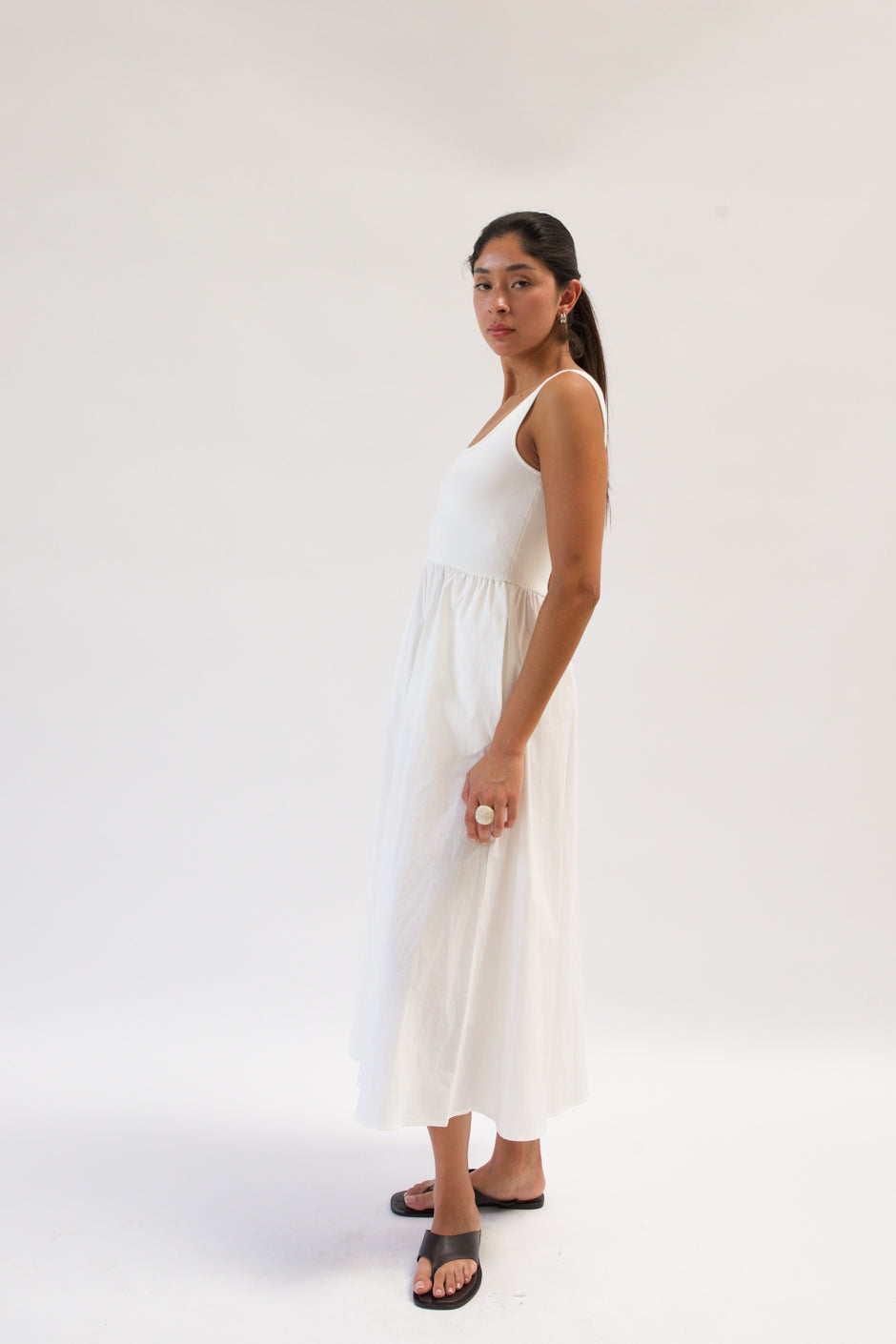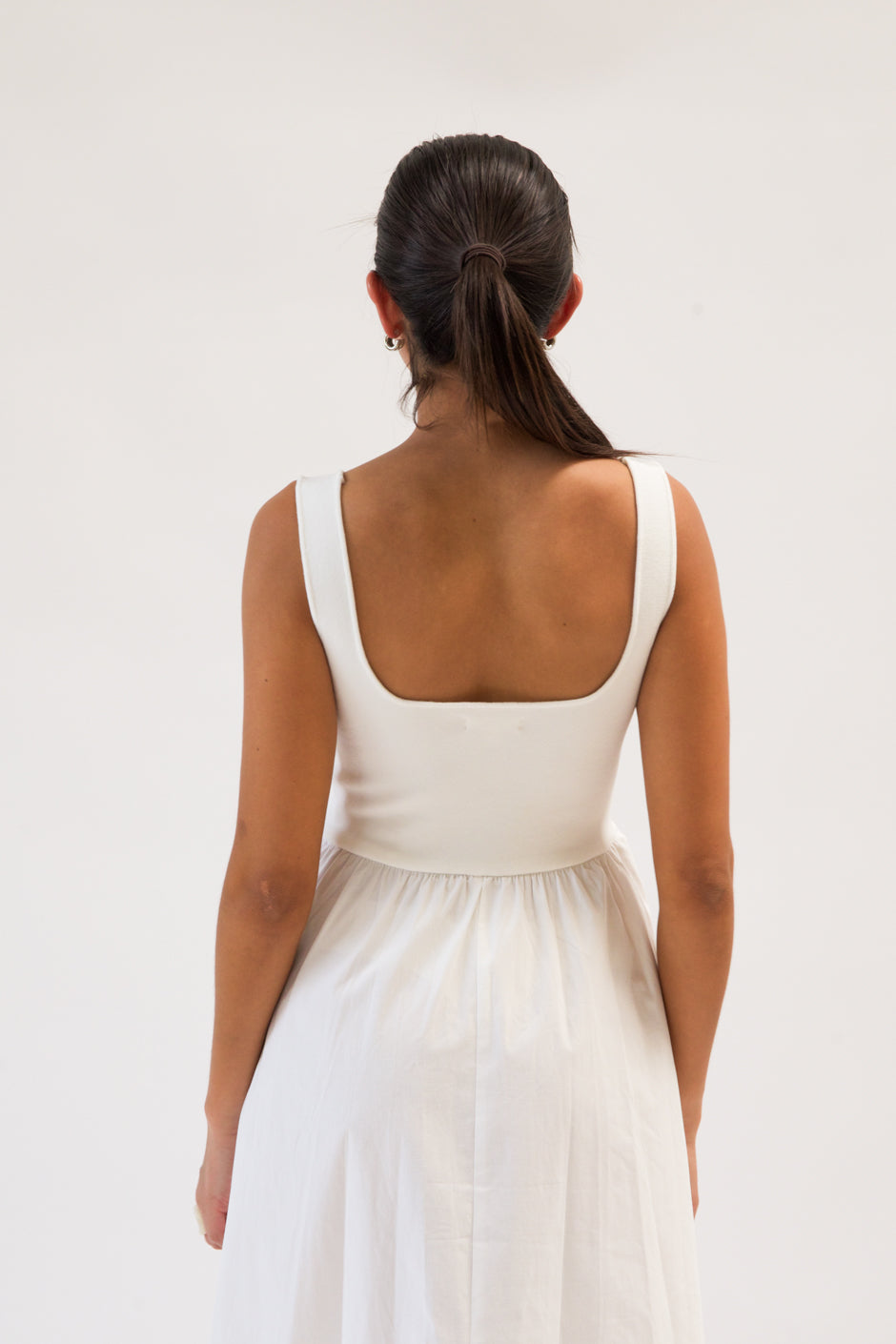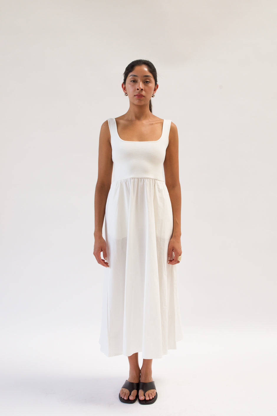 Maxi dress with a knit square neckline top and a woven full skirt. The top is 100%, the bottom is 95% Cotton, 5% Spandex.
